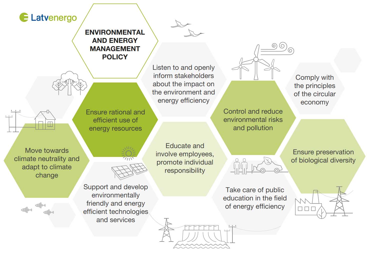 Latvenergo Group’s environmental protection activities are defined in the Sustainability Policy and Environmental and Energy Management Policy. Their goal is to ensure sustainable economic activity in accordance with national and international environmental protection standards. The Group’s environmental activities aim to:
