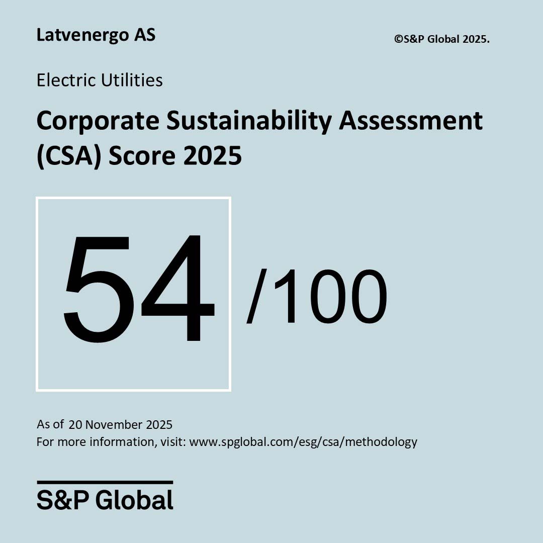 On 20 November 2025, Latvenergo AS received the Standard & Poor's Global Corporate Sustainability Assessment (CSA), scoring 54 points, which places Latvenergo AS among the top 30% of companies worldwide in the Electric Utilities sector. In total, 246 companies in this sector were assessed. S&P Global recognized Latvenergo AS initiatives across all ESG (Environmental, Social, Governance) dimensions, including climate strategy, human capital management, transparency and sustainability disclosure, risk management, and business ethics.