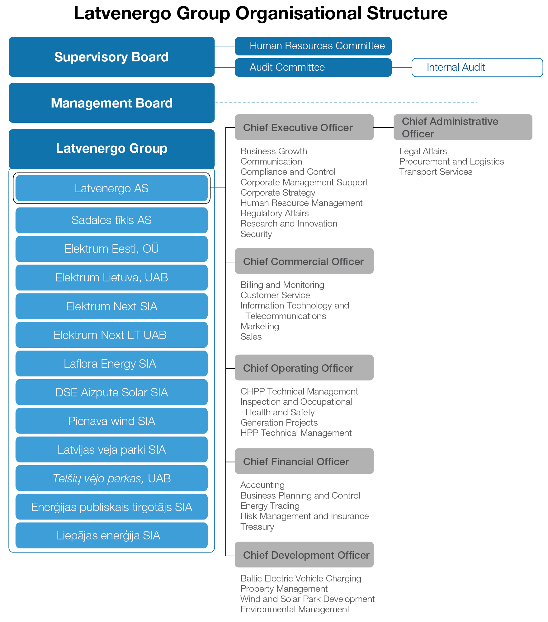 Generation of electricity and thermal energy, electricity and natural gas trade, sale of products and services related to electricity consumption and energy efficiency in the Baltic states, and administration of the mandatory electricity procurement process in Latvia.