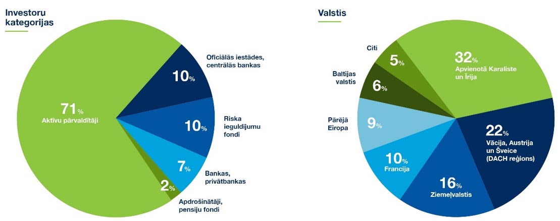 Investoru struktūra apliecina augsto uzticēšanos uzņēmumam un Latvijas tirgum kopumā. Lielāko daļu ieguldītāju - aptuveni 71% - veidoja aktīvu pārvaldītāji, kam sekoja oficiālās iestādes un centrālās bankas ar apmēram 10%, riska ieguldījumu fondi ar 10%, bankas un privātbankas ar 7%, kā arī apdrošinātāji un pensiju fondi ar aptuveni 2% no kopējā apjoma.