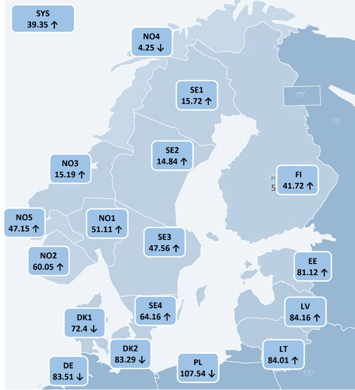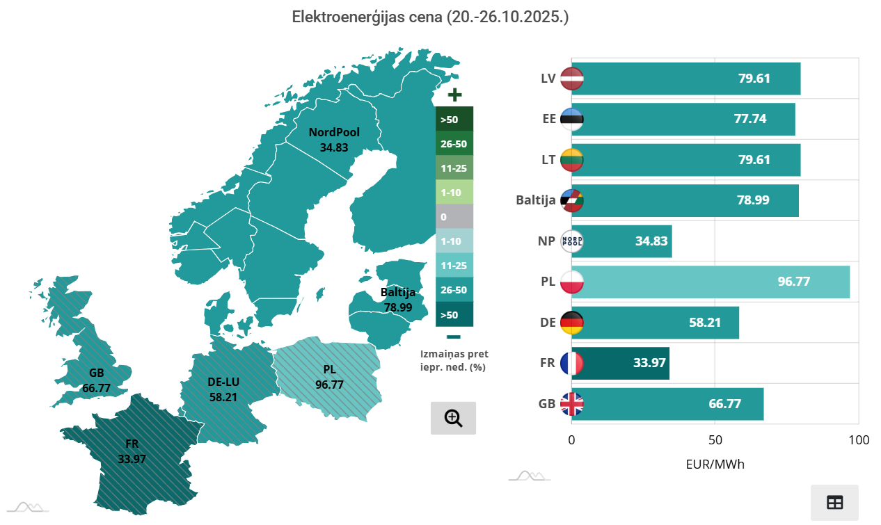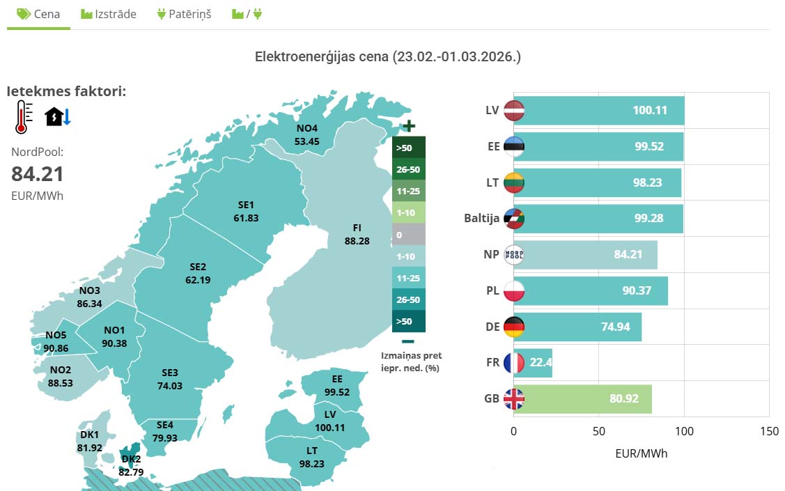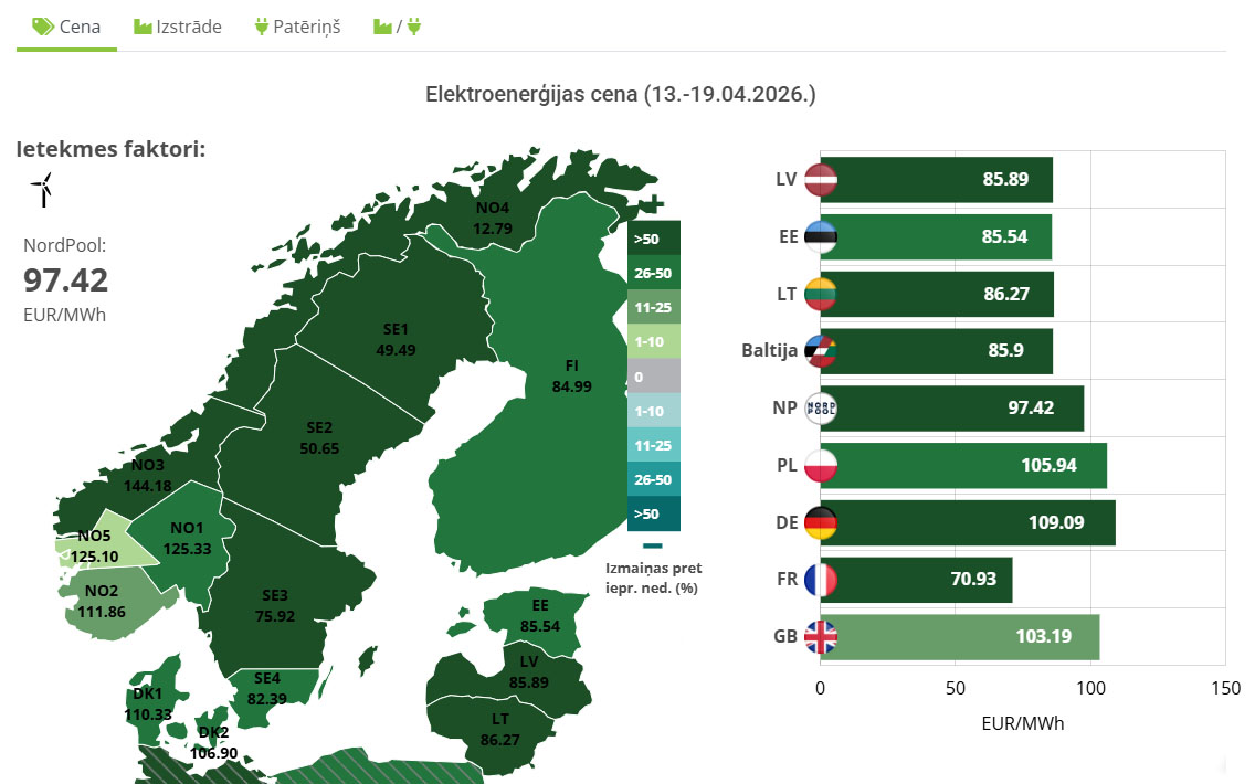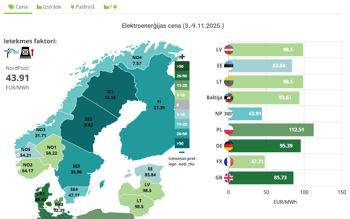 Piedāvājam ērti un uzskatāmi kartē, grafikos un tabulās apskatīt aktuālos datus par iknedēļas elektroenerģijas cenu, patēriņu un izstrādi Nordpool Skandināvijas un Baltijas valstu apgabalā, kā arī šo rādītāju izmaiņas attiecībā pret iepriekšējo nedēļu.