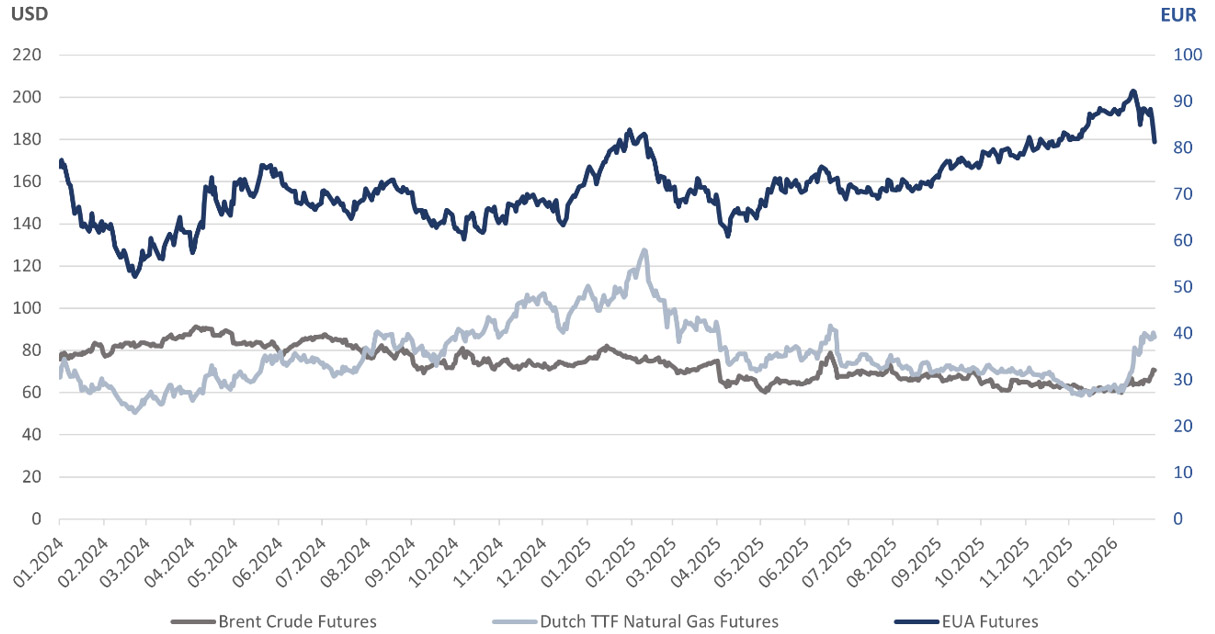 Eiropas emisijas kvotu Dec.26 kontrakta (EUA Future) cena janvārī turpināja pieaugt, mēneša laikā sasniedzot 88,13 EUR/t, kas ir par aptuveni 6% vairāk nekā iepriekšējā mēneša beigās, noslēdzoties Dec.25 kontrakta tirdzniecībai, un vienlaikus augstākais cenu līmenis kopš 2023.gada vasaras. Cenu pieaugumu veicināja zemāks izsoļu apjoms 2026.gadā, reakcijas uz makroekonomiskiem notikumiem, kā arī aukstie laikapstākļi Eiropā un ar tiem saistītais fosilās enerģijas, īpaši dabasgāzes, izmantošanas pieaugums siltumenerģijas un elektroenerģijas ražošanā, palielinot pieprasījumu pēc emisijas kvotām. Mēneša noslēgumā EUA cena atkāpās, ko veicināja maigāku laikapstākļu prognozes, mazinot emisijas kvotu pieprasījumu, kā arī investīciju fondu peļņas fiksēšana.