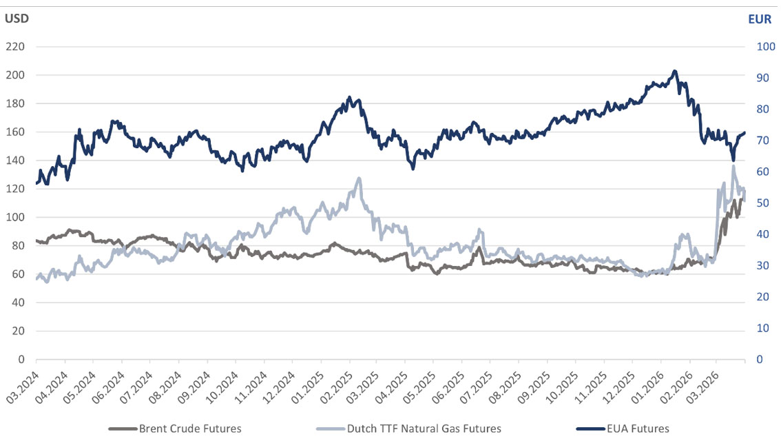 Eiropas emisijas kvotu Dec.26 kontrakta (EUA Futures) cena martā samazinājās par 7%, vidēji sasniedzot 70 EUR/t, kas ir zemākais līmenis pēdējo 11 mēnešu laikā. Mēneša pirmajā pusē cenas samazinājās, ko noteica politiskā nenoteiktība saistībā ar iespējamām izmaiņām EU ETS sistēmā, tostarp MSR korekcijas (mehānisms, kas regulē kvotu piedāvājumu tirgū), kā arī iespējamās izmaiņas bezmaksas kvotu piešķiršanā. Papildu ietekmi radīja investīciju fondu neto garo pozīciju samazināšanās. Mēneša vidū cena īslaicīgi nokritās zem 64 EUR/t, bet otrajā pusē cenas samērā strauji atguvās līdz ~72 EUR/t līmenim, ko veicināja Eiropas Komisijas signāli par EU ETS sistēmas saglabāšanu bez radikālām īstermiņa izmaiņām, kā arī pieaugošā korelācija ar gāzes cenām.