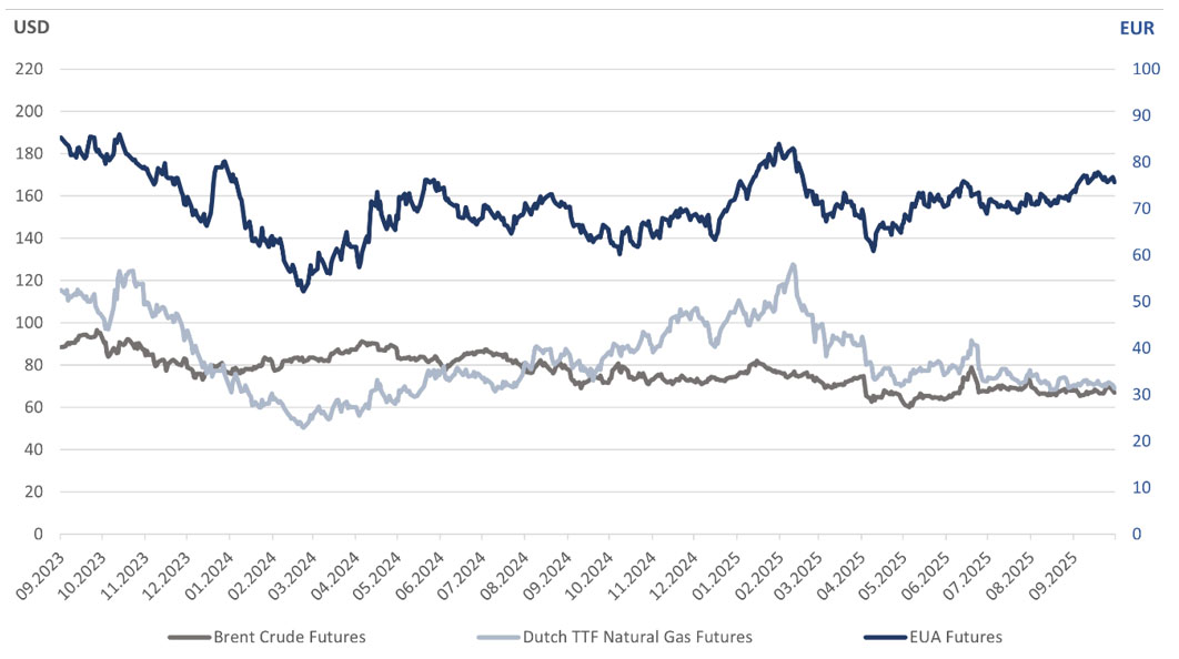 Eiropas emisijas kvotu Dec.25 kontrakta (EUA Futures) cena septembrī pieauga par 6% līdz 76,20 EUR/t, sasniedzot augstāko līmeni pēdējo septiņu mēnešu laikā. To veicināja uzņēmumu pirkumi pirms 30.septembra termiņa, kad jānodod kvotas par 2024.gada emisijām, kā arī tirgus dalībnieku garās pozīcijas, kas sasniedza augstāko līmeni vairāk nekā septiņu gadu laikā.