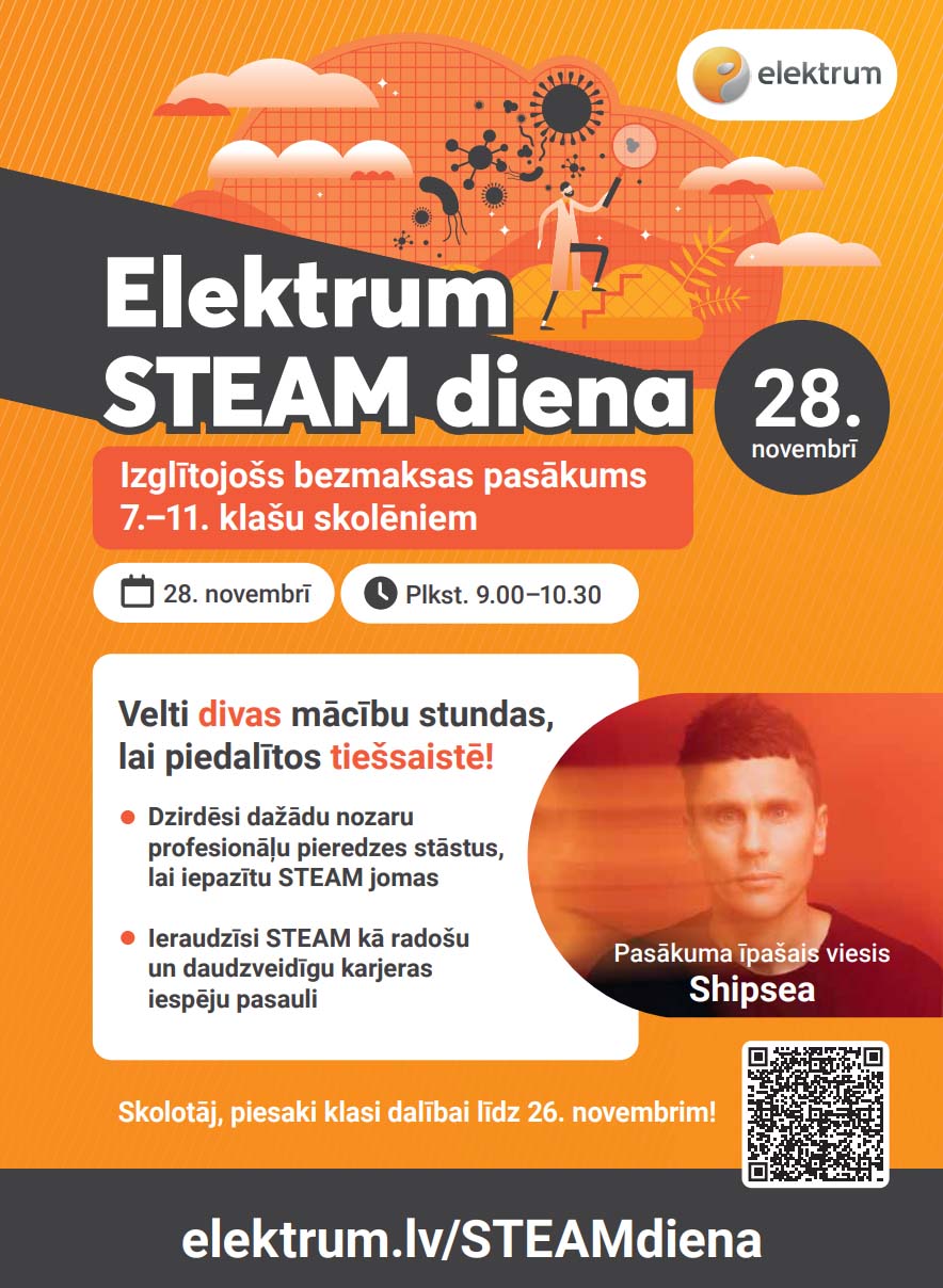 28. novembrī Latvijas 7.–11. klašu skolēni aicināti pievienoties tiešsaistes pasākumam “Elektrum STEAM diena”, lai tieši ar personīgu pieredzi un reāliem profesionāļu stāstiem iepazītu, kā zinātne, tehnoloģijas, inženierija, māksla un matemātika (STEAM) veido mūsdienu pasauli un mūsu nākotni. Iemācīties var ikviens, ja ir iespēja dzirdēt, redzēt un izmēģināt.